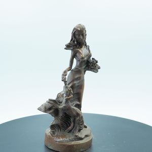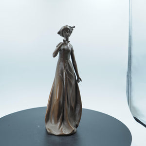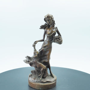 Copper Figurine of Young Girl Communicating with Bird, Long Skirt Design, Youthful Beauty