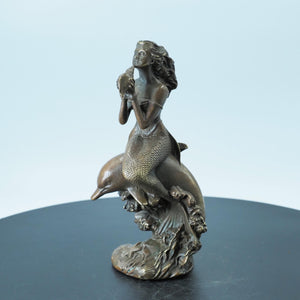 Copper Girl Blowing Conch Shell Sculpture with Mermaid and Dolphin Base, Music of the Sea
