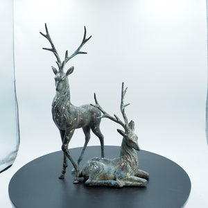 Pair of Bronze Brass Spotted Deer Figurines, Calm and Poised, Textured Artistic Decor